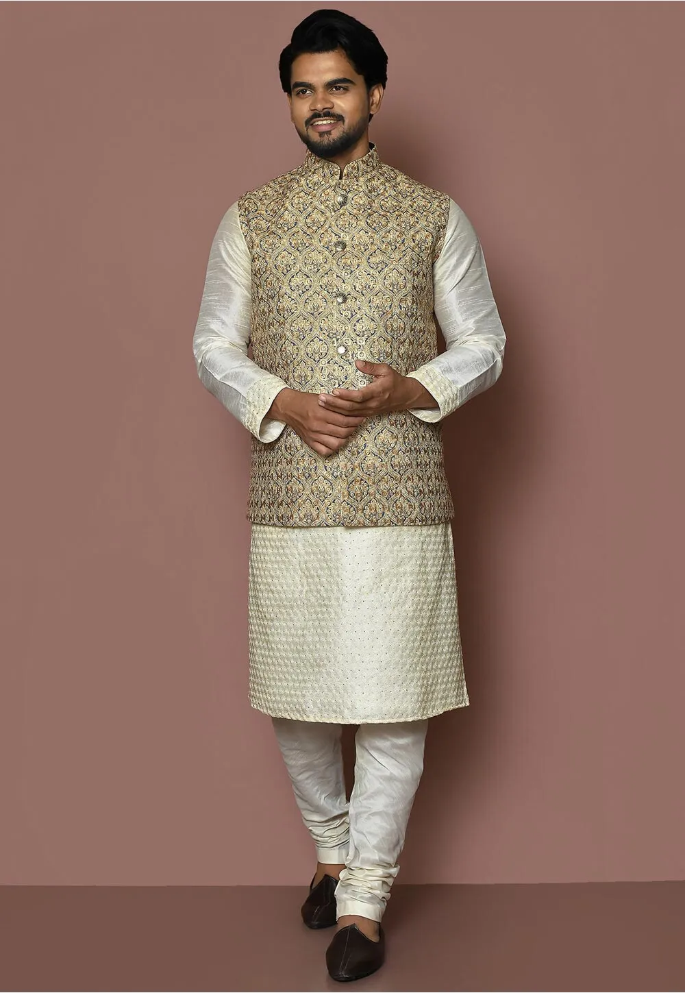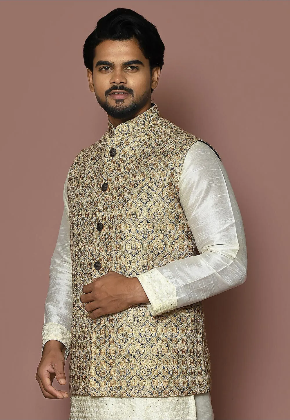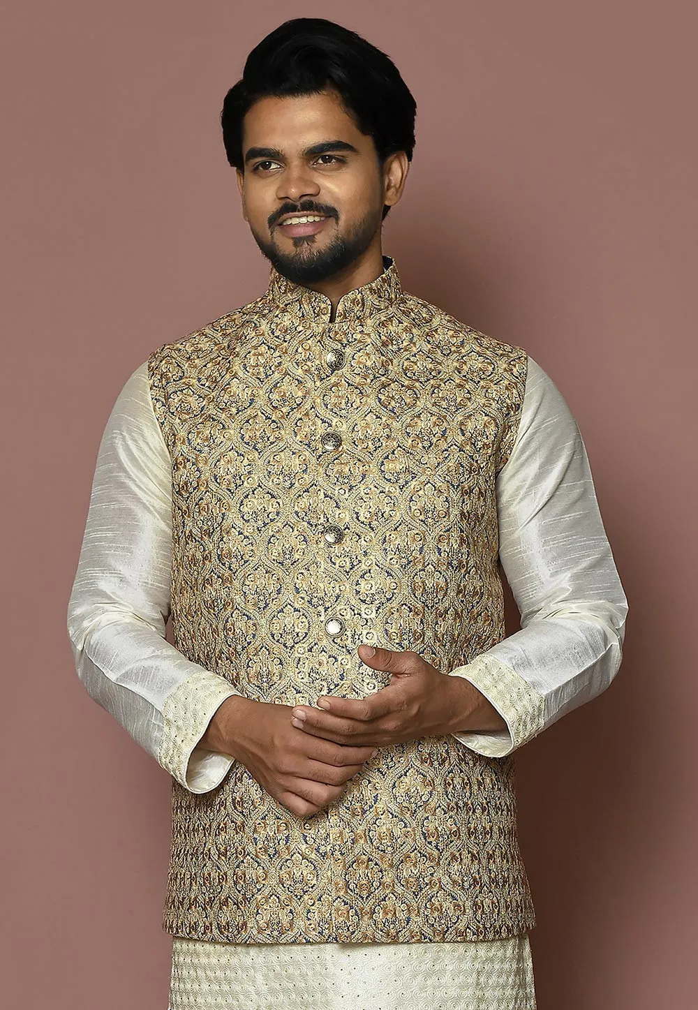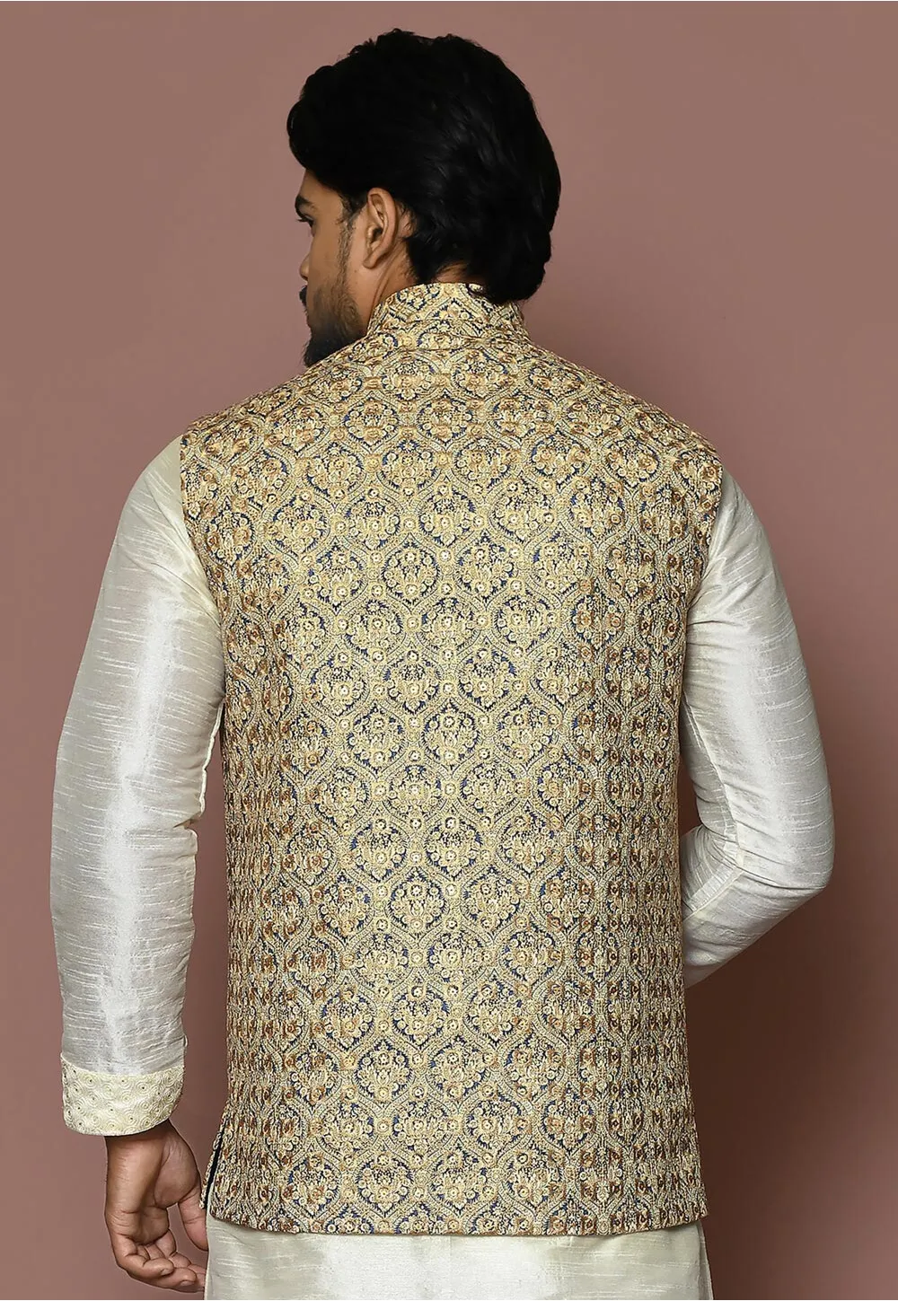 - Readymade Cotton Nehru Jacket in Beige and Blue