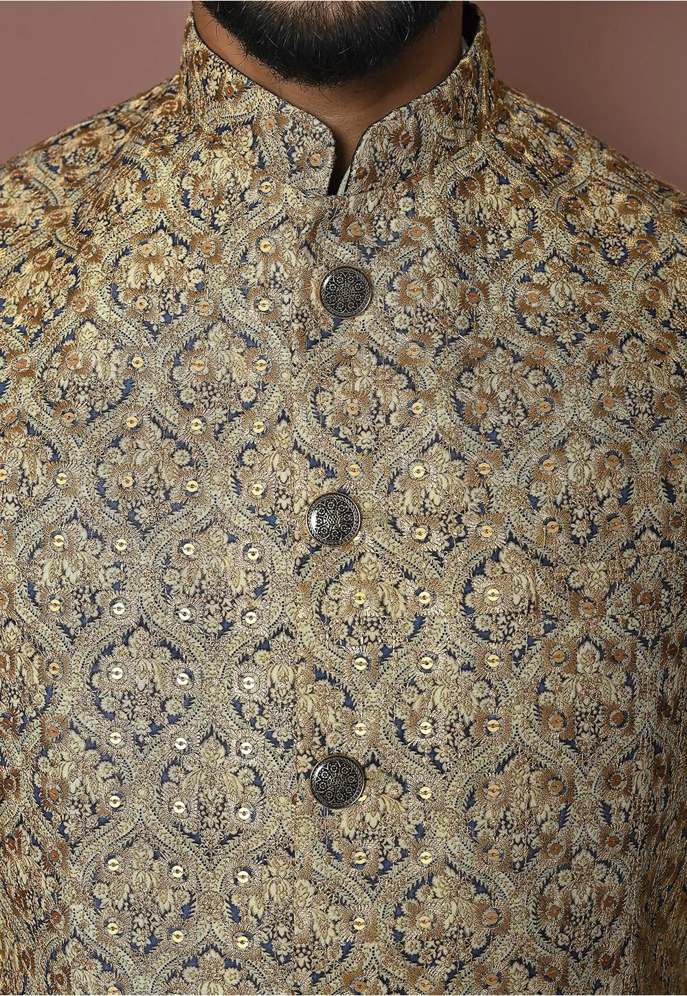 - This Sleeveless and Chinese Collar attire is Enhanced with Buttons, Resham and Sequins Work